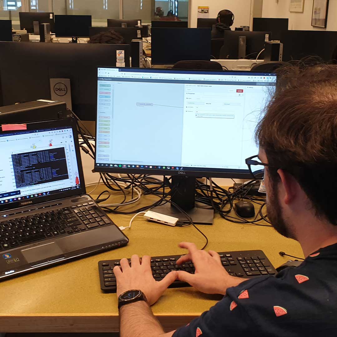 Node red is a browser based flow editor for wiring flows together. The flows are then deployed in a single click. JavaScript functions can then be written for functionality between the flows and nodes within.