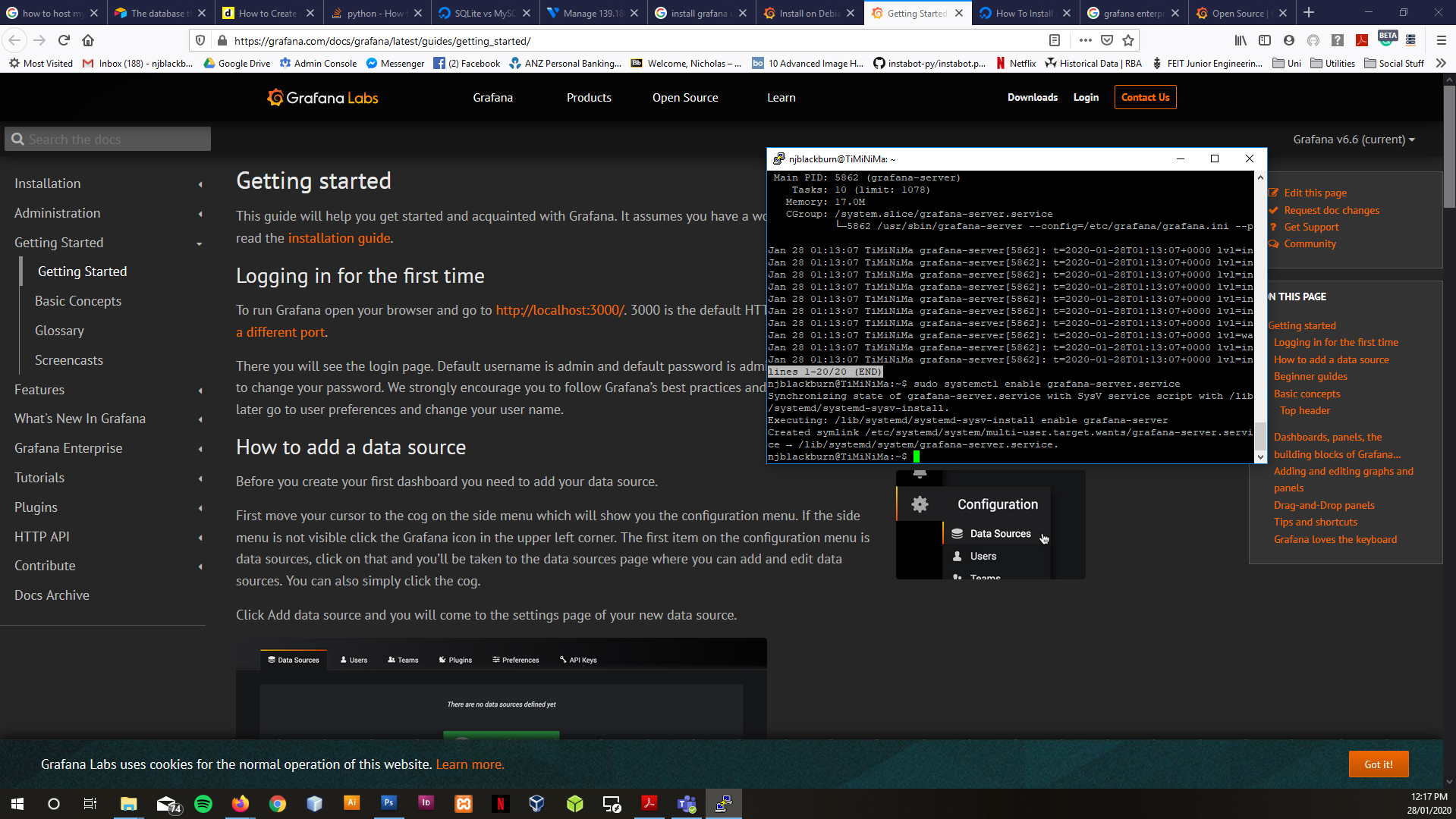 We split the task of installing all the useful applications (Grafana, mosquitto, InfluxDB & NodeRed) between each member in the group. I was tasked with installing Grafana. Using Putty I installed, ran Grafana configured users and applicatoion execution on startup. I followed the tutorials and guidelines from the following URLs: