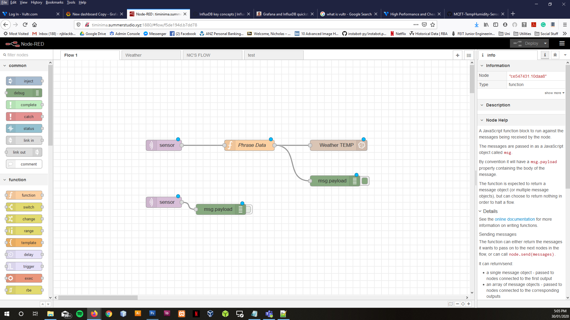 Initially when we installed NodeRed our flow had two MQTT in nodes, one for humidity data and one for Temperature. We tried to join the nodes into one single message payload for the InfluxDB node. The problem we face is how do we get the joined data into different columns in the database by one message payload?