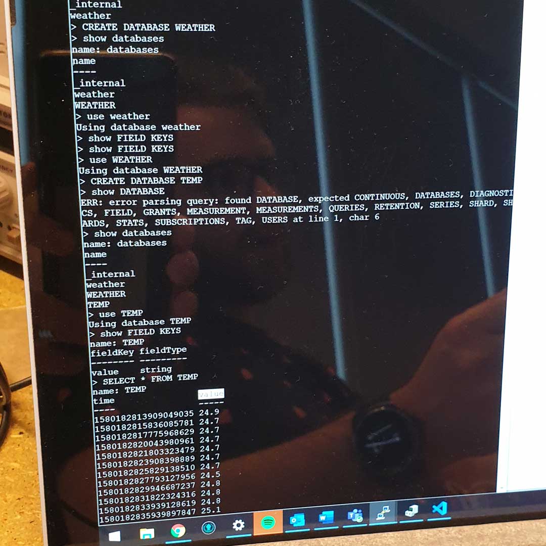 We had difficulties possibly with putting sensor data is the current pin is used for and LED and too fast for the sensor to operate. We changed the pin from D4 or D2 to D12 and seems to work correctly. We managed to fix our hardware errors and concentrate on our storage issues as we had difficulty in gettng our data into InfluxDB in the correct collumns. As with every good project there is a little research, trial, error, research, debug & trial again.We gained a better idea of how we can tackle the problem tomrrow!