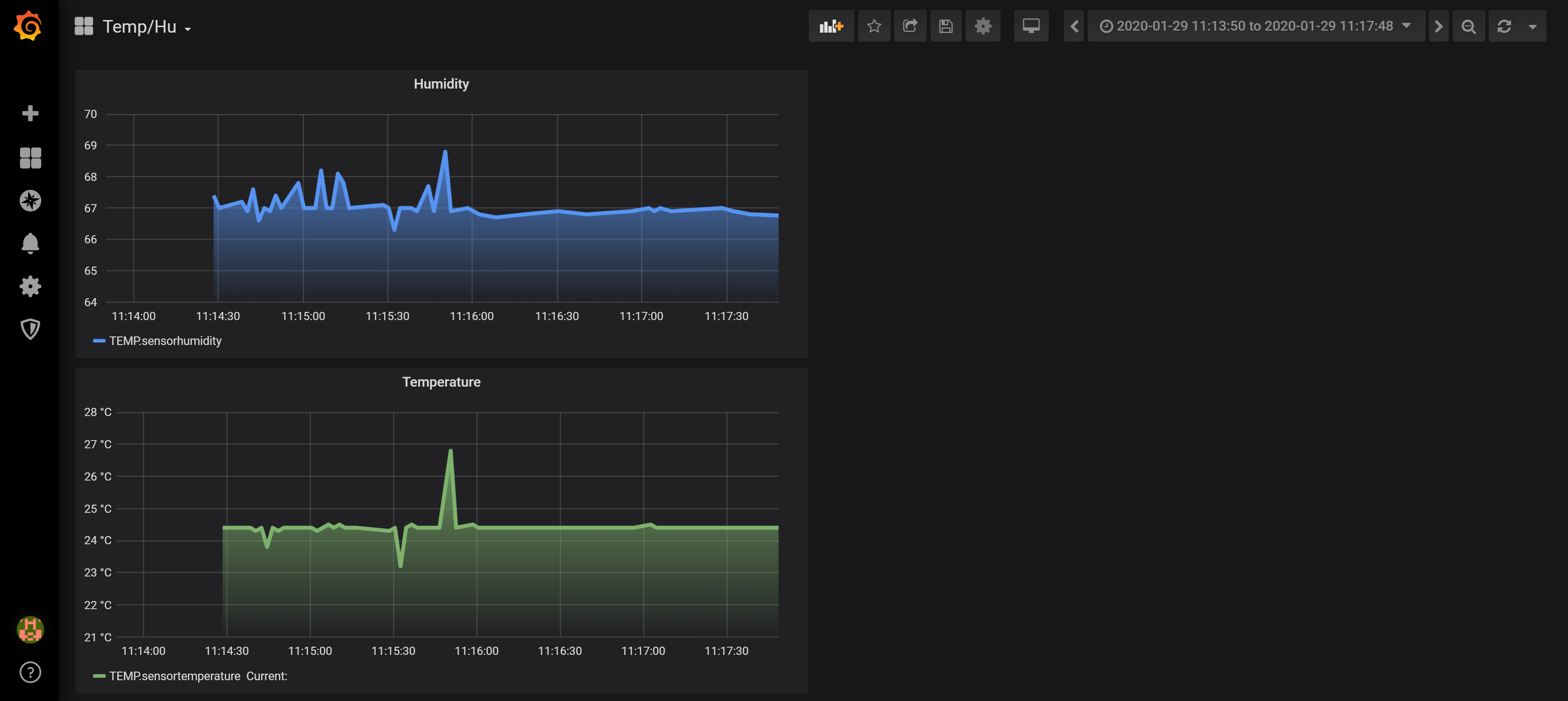 As we were able to split our message packet into an array for our message payload InfluxDB was able to put our data into the correct columns. By use of database queries in Grafana we can successfully visualise our data appropriately.